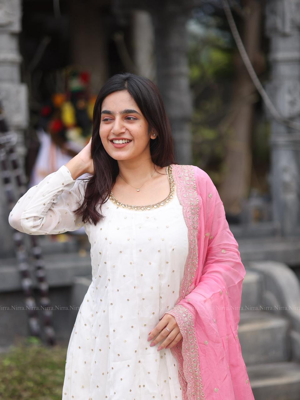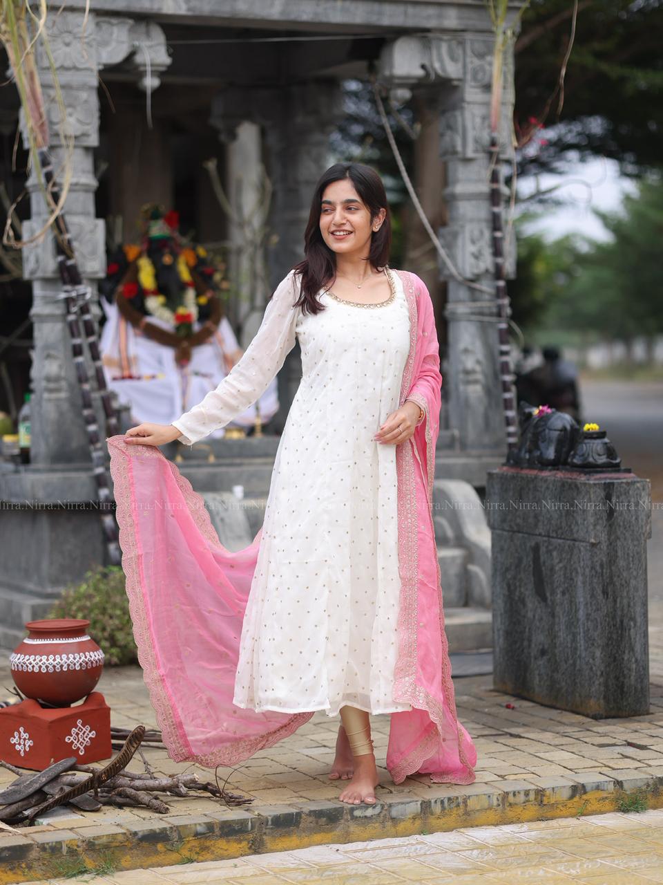 White georgette Anarkali with crystal lace work paired with embroidery baby pink organza shawl