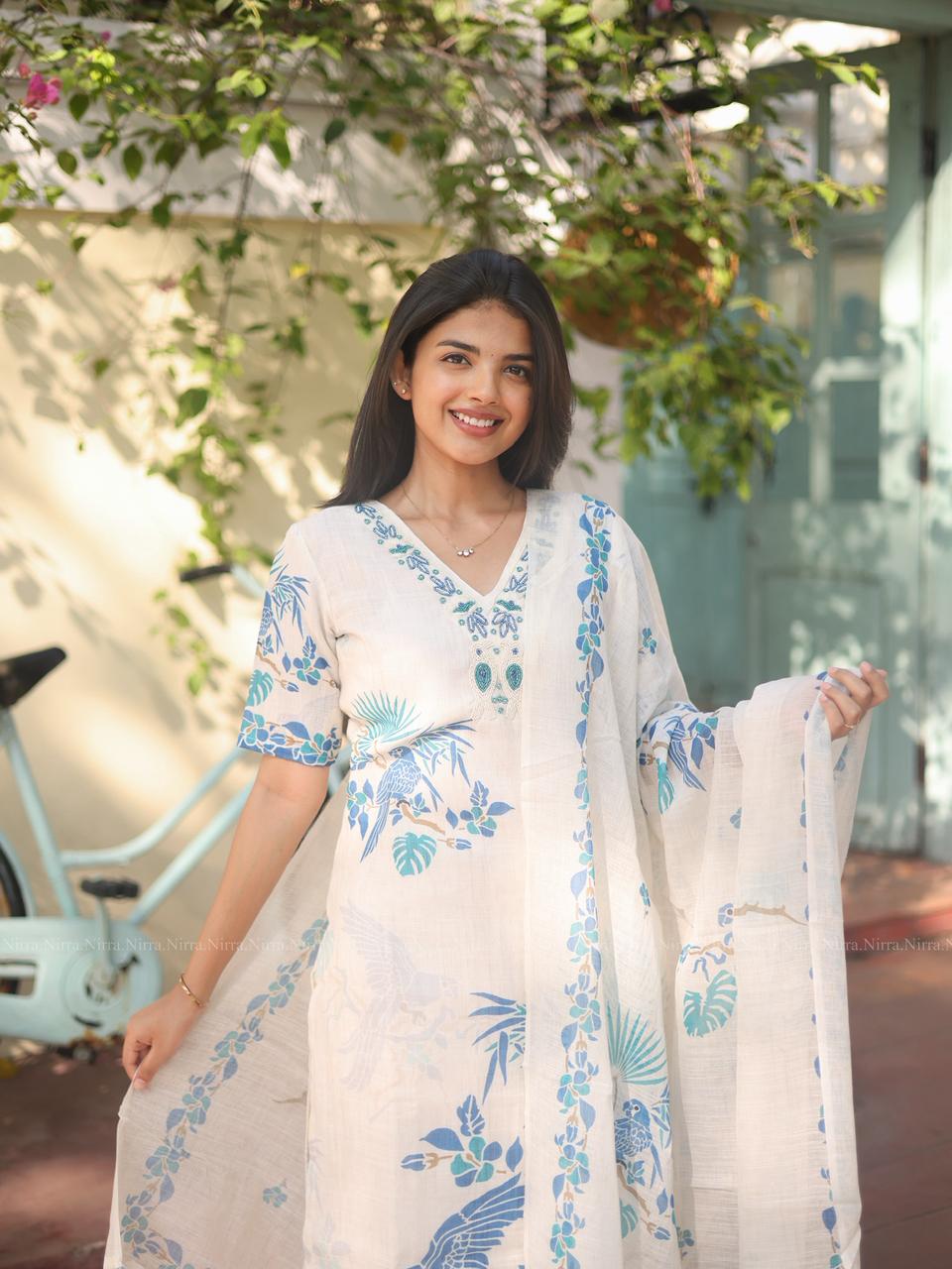 White premium linen bird digital print suit set